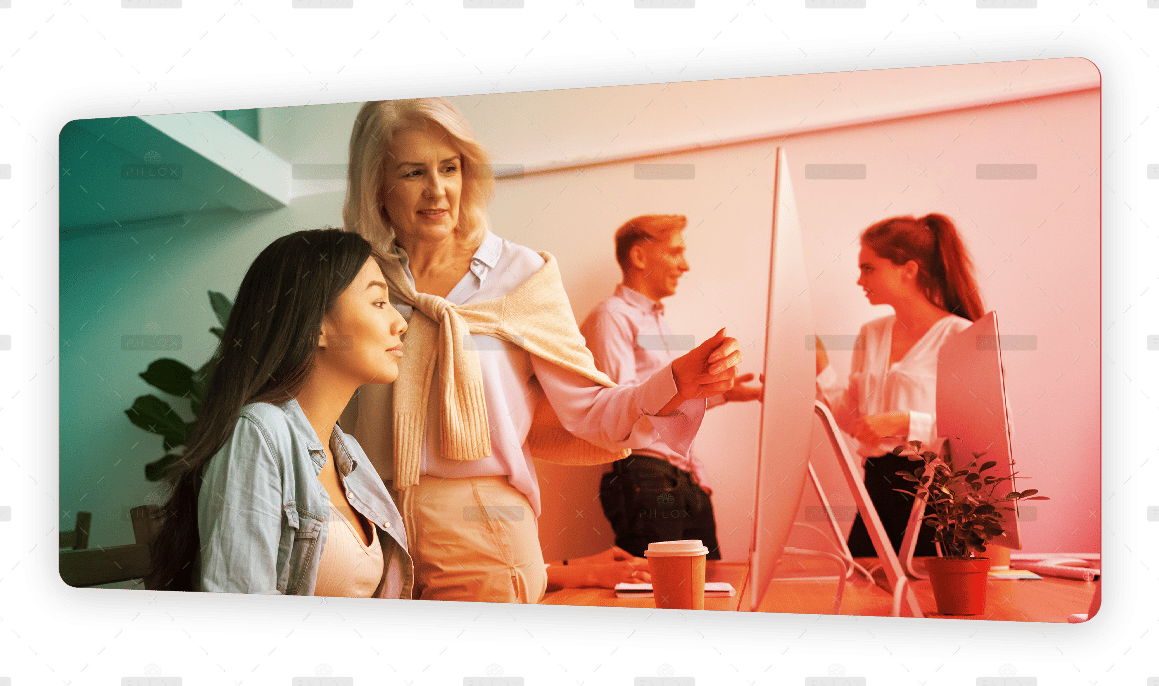 Team bespricht Ferienhaus-Verwaltung am PC. Büro, Kollegen, moderne Technik.